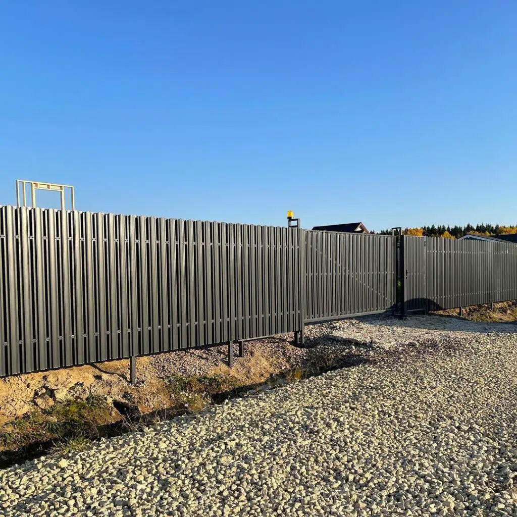 Оптимальное расстояние между металлическими опорами – 2,5 метра. При расчете от общей длины забора отнимают ширину ворот и калитки, остаток делят на 2,5 и округляют в большую сторону, а затем прибавляют еще одну винтовую опору для торца.